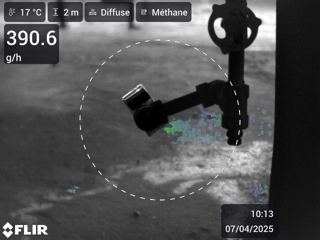 Fuite de gaz détectée et quantifiée par caméra OGI lors d'une intervention ITC sur site industriel.